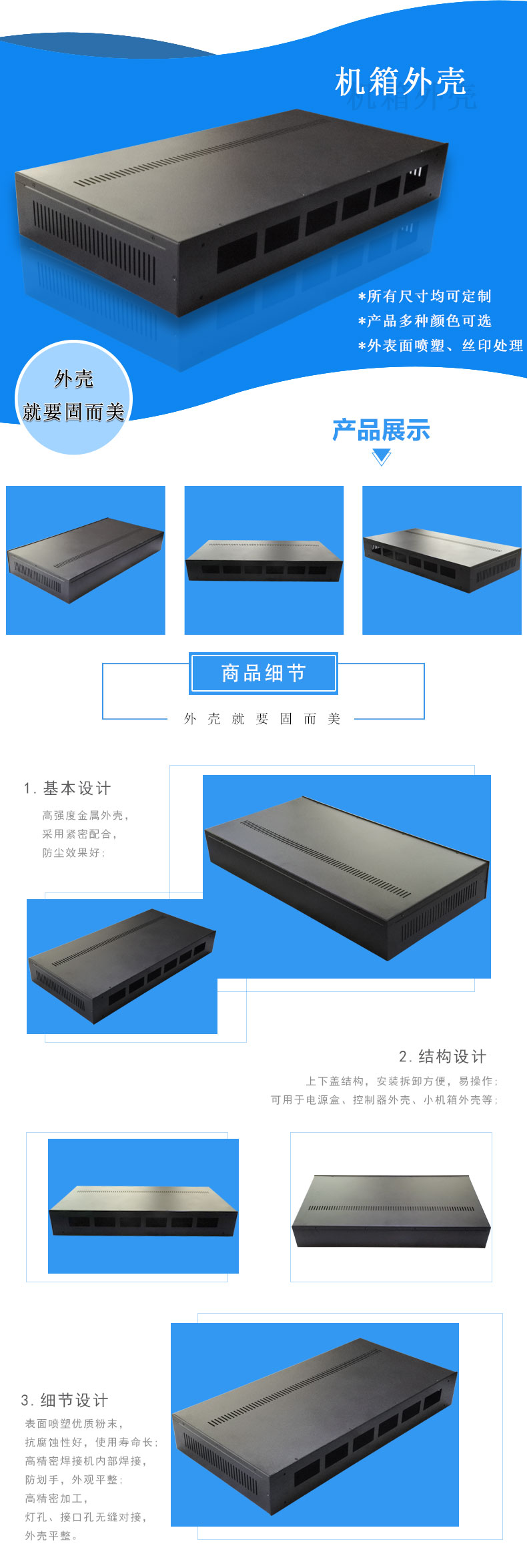 * 此款外殼適用于機箱外殼,工控服務機箱外殼,非標金屬機箱外殼定做,大機箱外殼來圖來樣設計。 * 產(chǎn)品材料:鍍鋅板 * 盒體采用開孔合理,免工具安裝 * 表面可噴塑,絲印 * 產(chǎn)品顏色和材料批量可訂制 * 所有尺寸均可按要求修改